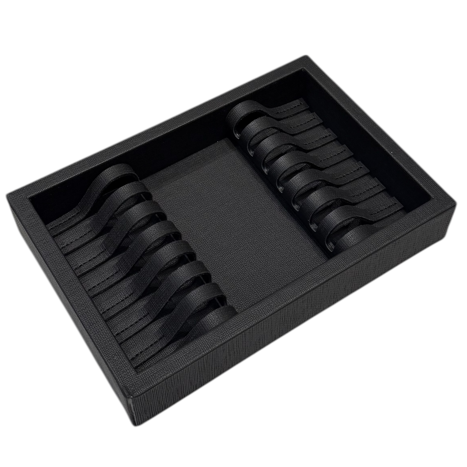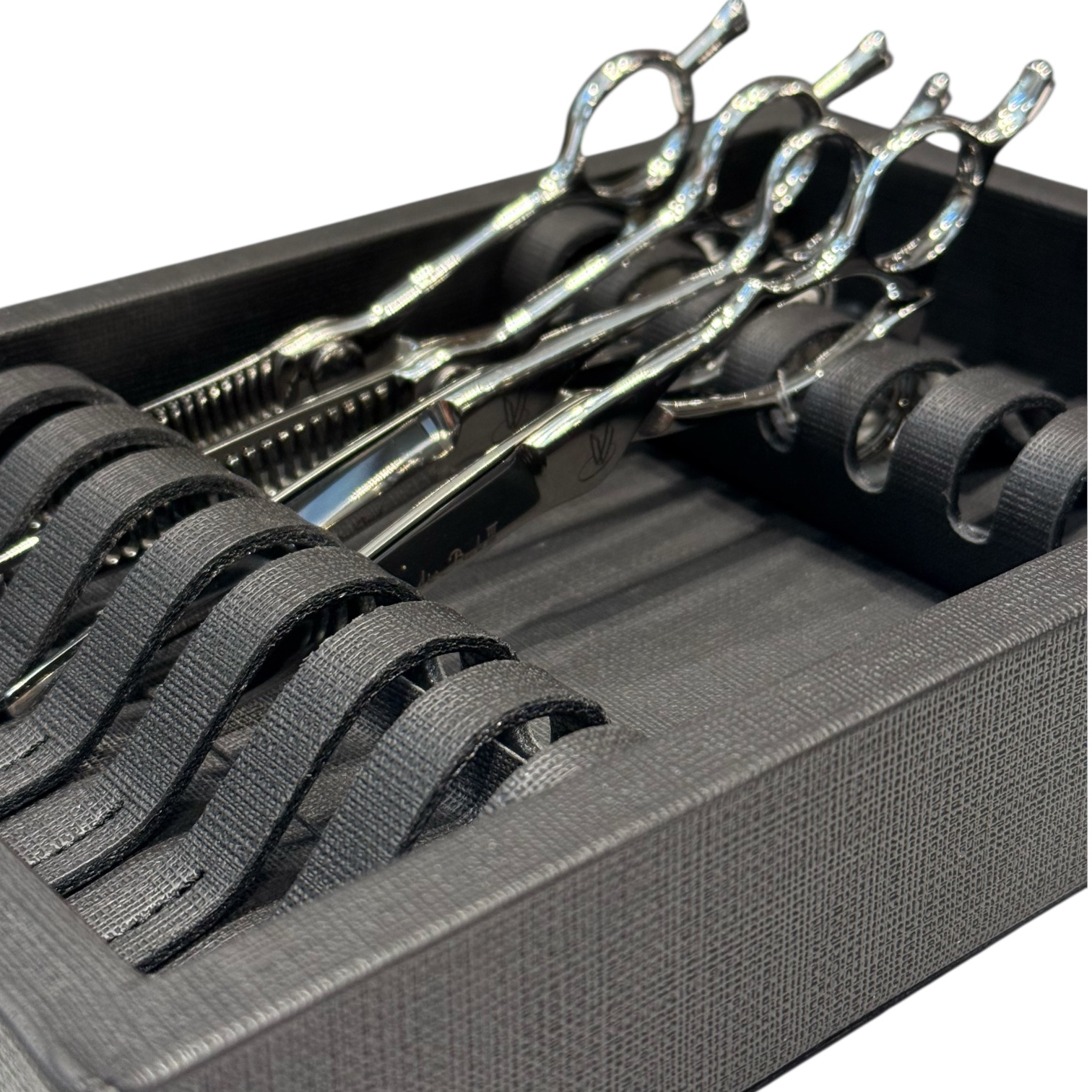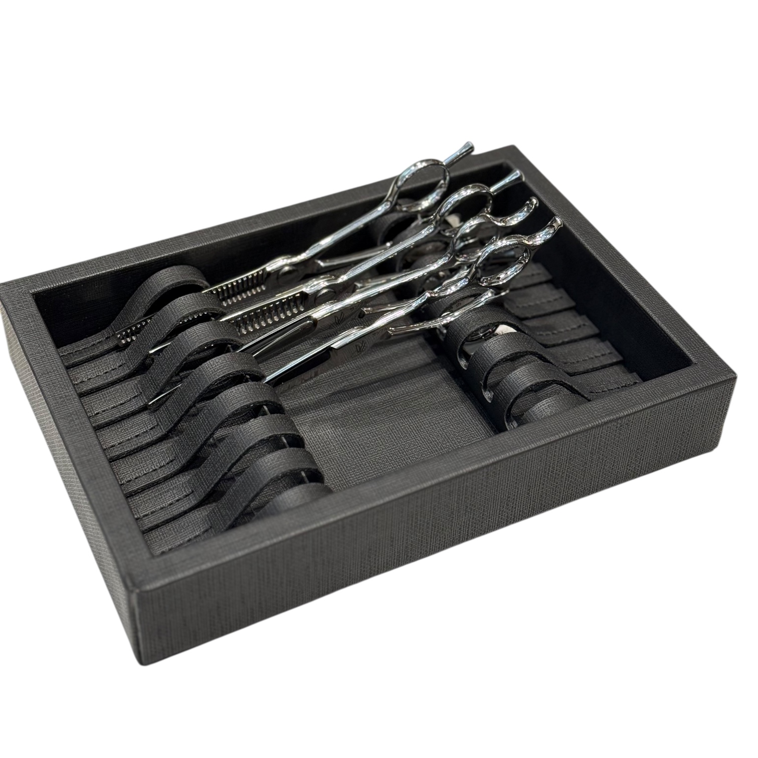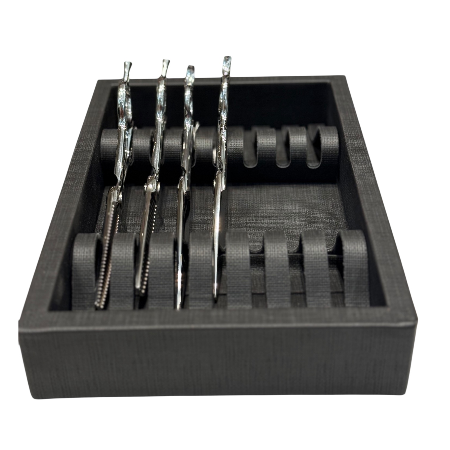 Pocke Scissors Tray Flat Type剪刀托盤尺寸: 230 x 160 × 40cm材質-內部:天然木材外部:合成皮這款剪刀支架最多可容納七把剪,並放置在工具車上。他包裹着防滑合成革,以確保穩定性。顏色:黑色/啡色